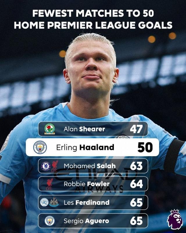 哈兰德50场比赛完成英超主场50球里程碑,效率仅次阿兰希勒