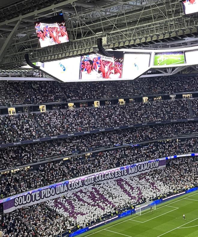 本场比赛前,皇马球迷在看台展示出横幅标语:“Solo te pido una cosa: que salgas este año campeón”