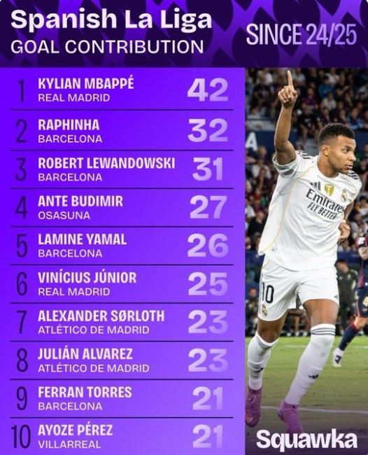 上赛季以来西甲直接参与进球数排行:姆巴佩42球居首大幅领先