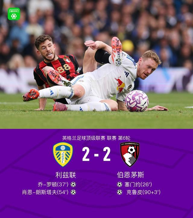 第90+3分钟,绝平!克鲁皮门前破门,伯恩茅斯2-2利兹联