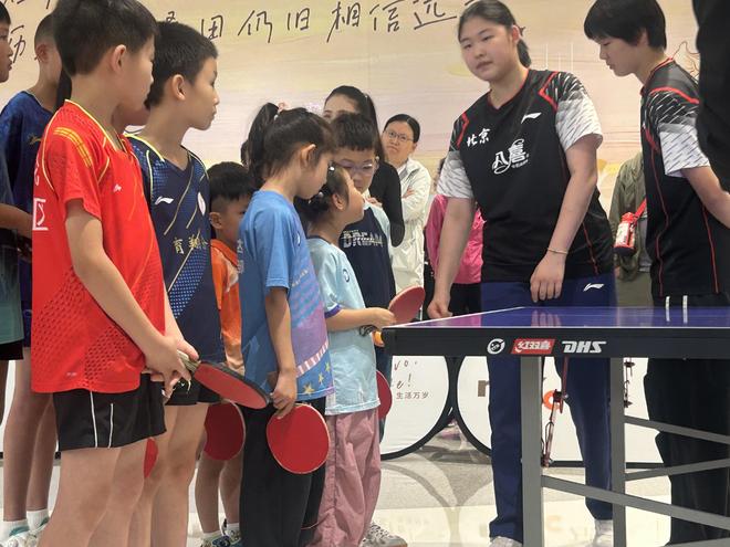 在通州万象汇四层沐光港湾,乒乓球撞击台面的声音响彻整个空间,夹杂着孩子们的笑声与观众的喝彩声。北京乒乓球队的丁沫含、杨禹涵与乒乓球俱乐部的小选手面对面,分享个人经历,并和小选手们进行趣味挑战赛。小选手们轮番上阵与专业运动员过招,虽然比分悬殊,但每个孩子都打得异常认真。现场气氛在趣味挑战赛环节达到顶点,孩子们把训练中遇到的困惑一一向运动员请教,获得了手把手的指导。