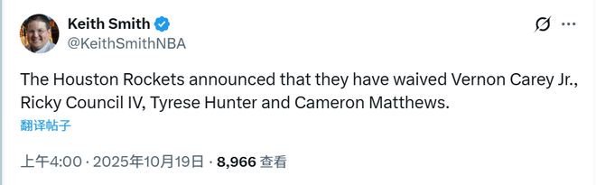 康瑟尔拥有近期NBA经验,过去两个赛季均效力于76人队,后者在7月底将其裁掉。这位24岁的侧翼球员原本预计加盟篮网队,但该交易最终告吹,他最终在周五与火箭队签下了一份训练营合同。凯里曾是NBA次轮秀,拥有三年NBA经验。不过他已缺席联盟两个赛季,最近一次征战是在2023-24赛季,效力于土耳其的卡尔希雅卡篮球俱乐部。火箭队的常规赛阵容似乎已确定,目前拥有14份保障性标准合同,且3个双向合同名额均已填满。受财务状况限制——球队薪资已触及“第一土豪线”,目前仅低于该阈值约125万美元——除非通过交易削减开支,否则火箭队在本赛季晚些时候之前无法签下第15位标准合同球员。火箭14+3阵容具体如下——标准合同14人:杜兰特、申京、范弗利特、亚当斯、芬尼-史密斯、小贾巴里-史密斯、谢泼德、阿门-汤普森、卡佩拉、伊森、杰夫-格林、阿隆-霍勒迪、奥科吉、泰特双向合同3人:克劳福德、JD-戴维森、哈里斯