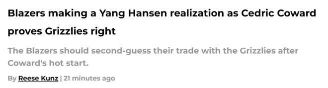 北京时间10月26日,灰熊11号秀考沃德的爆发,让波特兰的一些媒体讨论起杨瀚森来。毕竟,考沃德正是开拓者换来杨瀚森那笔交易的筹码。开拓者队记Reese Kunz点评如下——