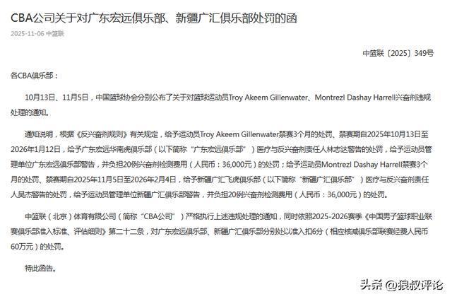 北京时间11月6日,随着中国篮协官宣哈尔雷的兴奋剂违规事件同样是禁赛三个月,俱乐部承担3.6万的检测费,至此,中国篮协层面正式结束了相对应的处罚。但CBA联赛公司进行了追加罚单,对广东宏远俱乐部和新疆广汇俱乐部分别处以准入扣6分(相应核减俱乐部联赛经费人民币60万元)的处罚。 具体如下:10月13日、11月5日,中国篮球协会分别公布了关于对篮球运动员Troy Akeem Gillenwater、Montrezl Dashay Harrell兴奋剂违规处理的通知。通知说明,根据《反兴奋剂规则》有关规定,给予运动员Troy Akeem Gillenwater禁赛3个月的处罚、禁赛期自2025年10月13日至2026年1月12日,给予广东宏远华南虎俱乐部(以下简称“广东宏远俱乐部”)医疗与反兴奋剂责任人林志达警告的处罚,给予运动员管理单位广东宏远俱乐部警告,并负担20例兴奋剂检测费用(人民币:36,000元)的处罚;给予运动员Montrezl Dashay Harrell禁赛3个月的处罚、禁赛期自2025年11月5日至2026年2月4日,给予新疆广汇飞虎俱乐部(以下简称“新疆广汇俱乐部”)医疗与反兴奋剂责任人吴杰警告的处罚,给予运动员管理单位新疆广汇俱乐部警告,并负担20例兴奋剂检测费用(人民币:36,000元)的处罚。中篮联(北京)体育有限公司(简称“CBA公司”)严格执行上述违规处理的通知,同时依照2025-2026赛季《中国男子篮球职业联赛俱乐部准入标准、评估细则》第二十二条,对广东宏远俱乐部、新疆广汇俱乐部分别处以准入扣6分(相应核减俱乐部联赛经费人民币60万元)的处罚。中国反兴奋剂中心在6月23日发布的公告显示,广东宏远俱乐部的吉伦沃特和新疆广汇俱乐部的哈雷尔分别在4月16日和15日的赛内检测中被查出羧基四氢大麻酚阳性,两人都放弃了B瓶检测。