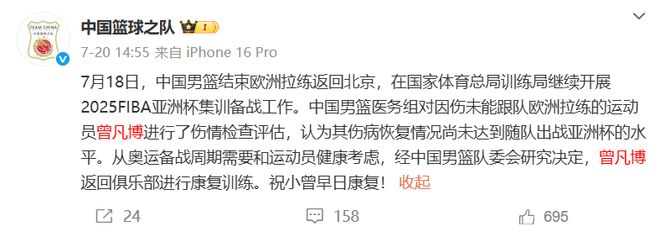 恭喜!NBL球队有意曾凡博!中国男篮等回首发四号位