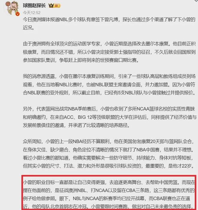如果曾凡博仍有挑战NBA的想法,那么NCAA是一个好出路,曝光度远比NBL和CBA高;若是想历练,NBL乃绝佳选择,周琦就曾在澳洲打过球并得到极大的提升。