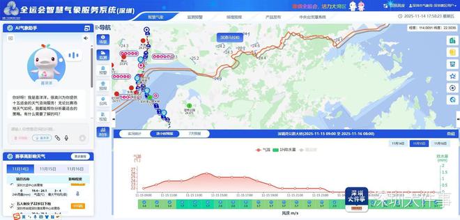 赛道旁的气象应急车内,深圳市气象局首席预报员陈训来博士正紧盯着短临预报决策支持平台上跳动的数据——来自生物舒适度观测仪的WBGT指数,以及香港加密观测点传来的深圳湾大桥段风力数据,在此刻汇于一方屏幕。