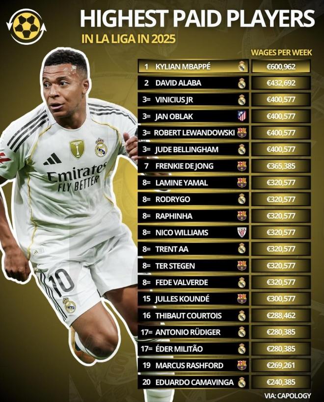 - 西甲 | 西甲球员工资排名前二十曝光!皇马11人巴萨7人!姆巴佩每周469万