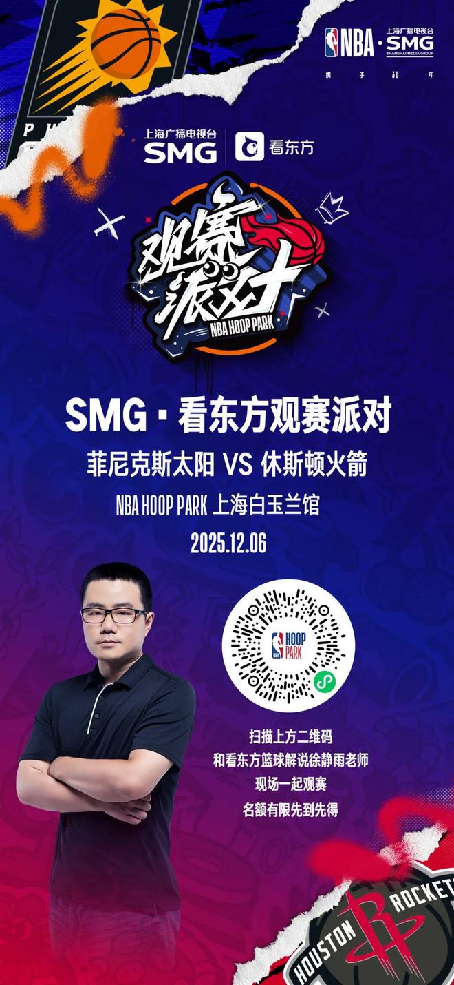 徐静雨亲临现场和大家一起看球侃球全程解说不亦乐乎杜兰特、狄龙各自面对“旧主”谁的“反戈一击”更具杀伤力?派对专属体验·LED大屏幕沉浸式观赛爆燃音效震撼全场·限定礼品NBA周边等你来赢取好礼拿不停·全场互动环节让你看得过瘾玩得开心·球队专属应援装备置身于现场为你的主队疯狂打Call活动地点时间地点:上海市虹口区东长治路588号SMP上海白玉兰广场北门5楼NBA HOOP PARK2025年12月6日上午8点30分签到入场