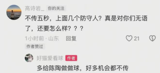 场上的事情还不是最滑稽的,更滑稽的是高诗岩赛后还跑到社媒账号上怼球迷。“不传5秒,上面几个防守人?真对你们无语了,还要怎么样???”
