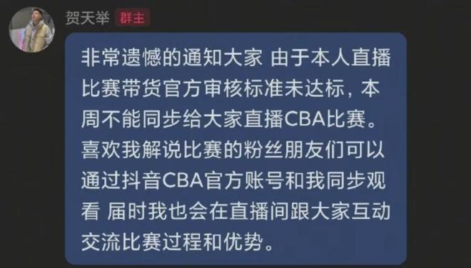但这个收入是不稳定且几乎不可能达到跟咪咕签约的水准的,各位篮友想必心里也清楚,真没有太多人愿意在CBA上面进行大规模的消费。举个最简单的例子,昨晚辽篮名宿贺天举在自己的粉丝群里说,因为他在转播时的带货销量不达标,暂时失去了个人抖音账号直播CBA比赛的资格。