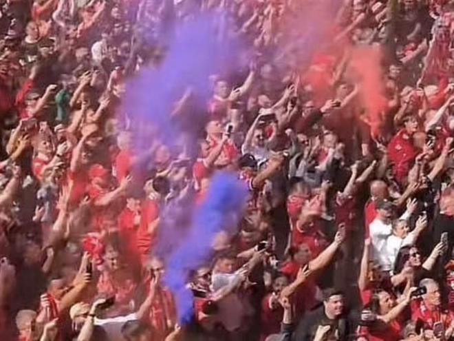 作为红军利物浦的同城死敌,埃弗顿的代表色是蓝色。一位埃弗顿球迷买了10000个蓝色烟雾弹,花了四周时间把蓝色包装换成红色的,并在利物浦夺冠当天把这些东西全卖了出去。从夺冠庆祝现场图片来看,安菲尔德内外都出现了属于死敌的蓝色烟雾。